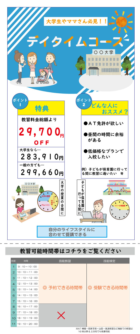 ・技能教習の予約は、9:10から16:00までとなります